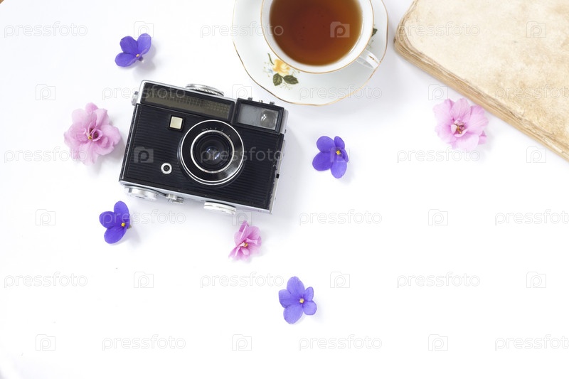 Композиция с чашкой чая, фотокамерой и книгой