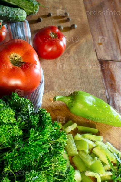 Помидоры и петрушка на деревянном фоне