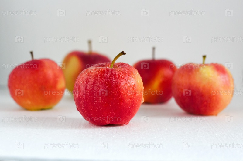 Спелые красные яблоки с каплями на белом фоне