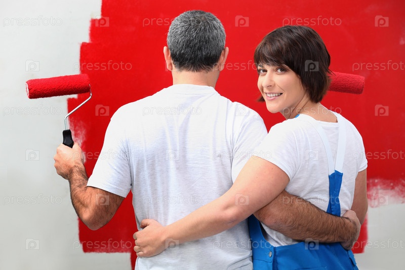 Мужчина и его жена красят стены в красный цвет