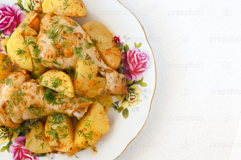 Жареные куриные ноги и картофель на белой тарелке