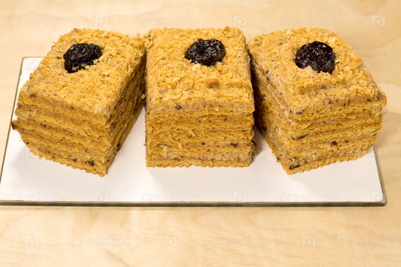 Восхитительный медовый торт с черносливом и орехами на черном фоне