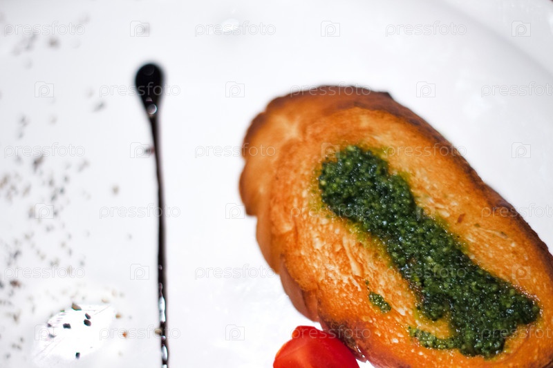 Вкусный хлеб с чесноком, сыром и зеленью на белой тарелке