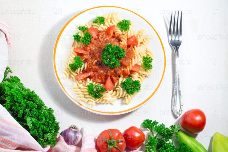 Тарелка пасты с томатным соусом и вилкой