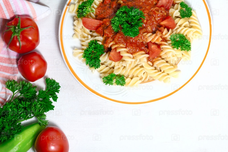 Макароны с помидорами, петрушкой и сладким перцем на белом фоне