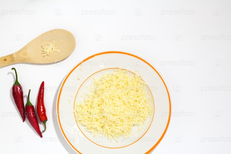 Тертый сыр на белой тарелке с перцем чили