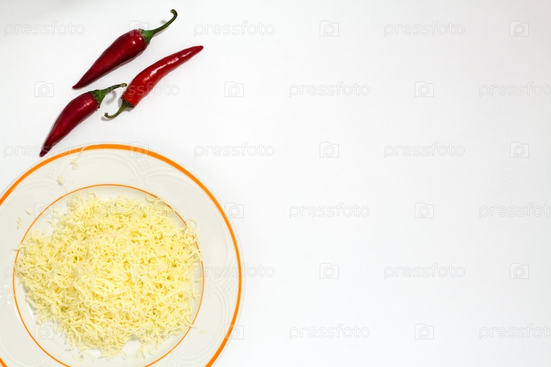 Сыр тертый на белой тарелке и белый фон