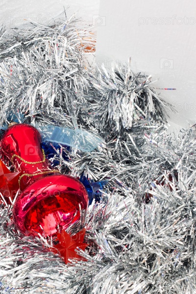 Рождественские игрушки на блестящем фоне мишуры