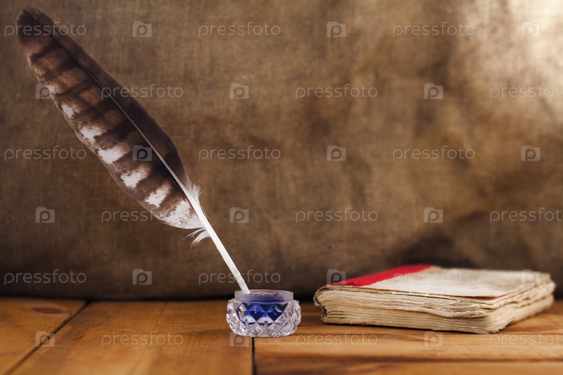 Гусиное перо, бутылка чернил и старые книги