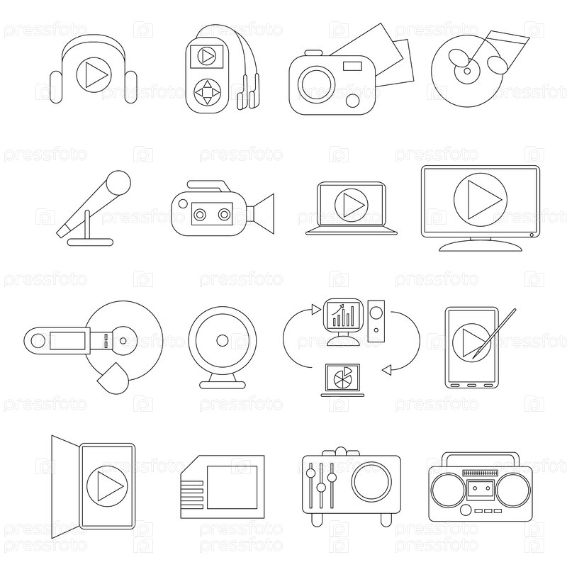 Набор мультимедийных икон, стиль тонкой линии