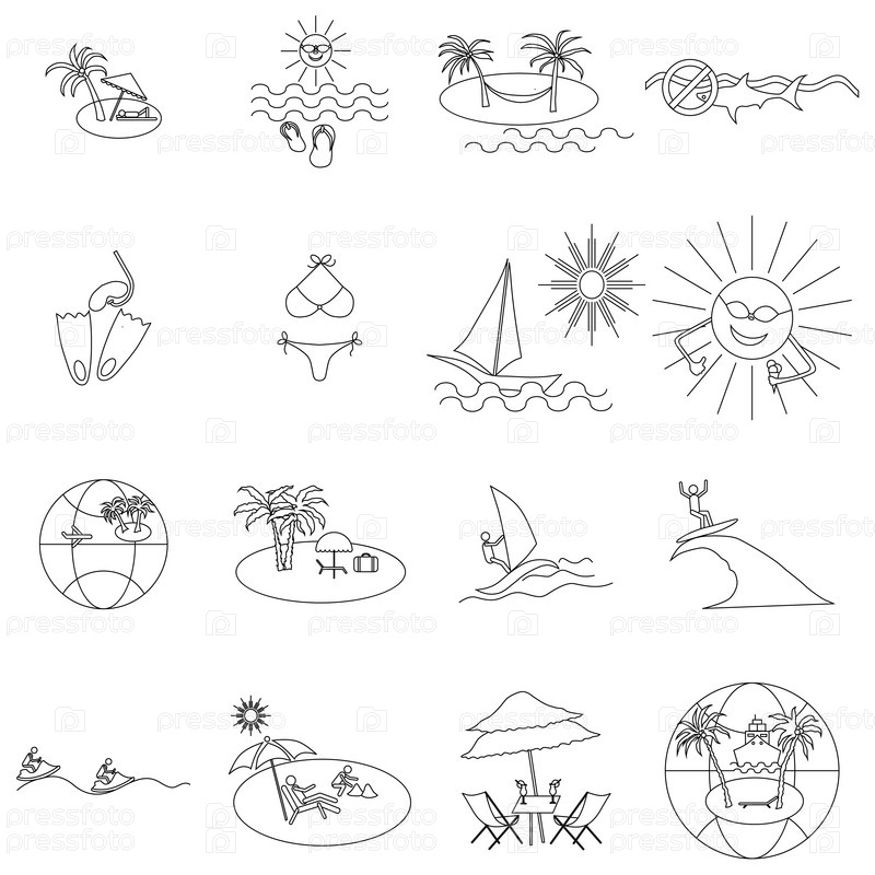 Набор пляжных икон, стиль тонкой линии