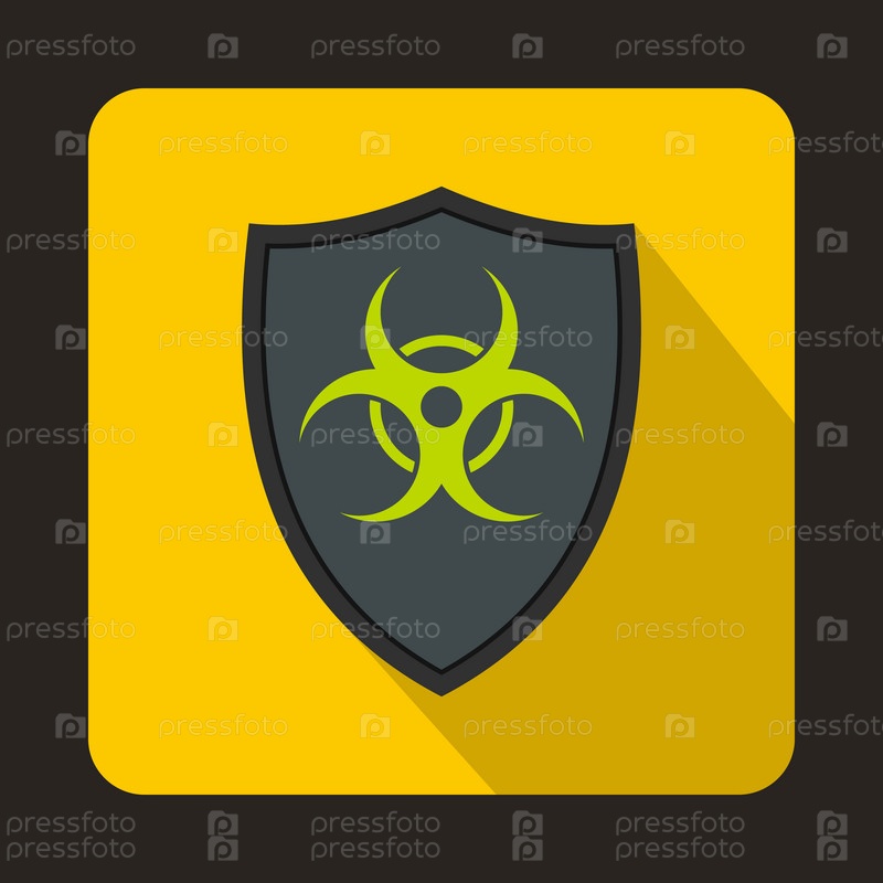 Серый щит с иконой знака биологической опасности в плоском стиле на желтом фоне