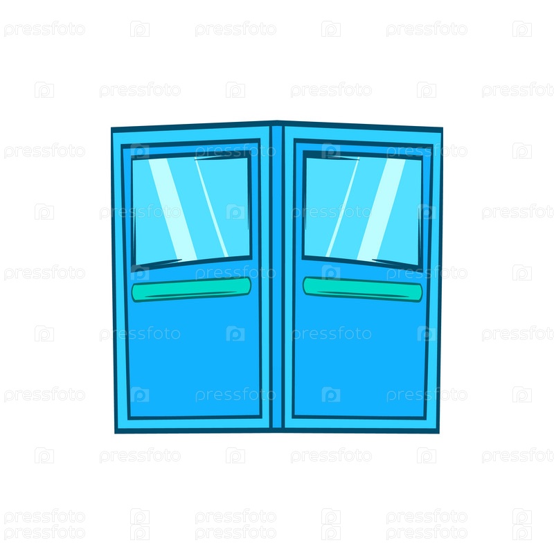 Синяя икона двойных входных дверей в стиле мультфильма на белом фоне