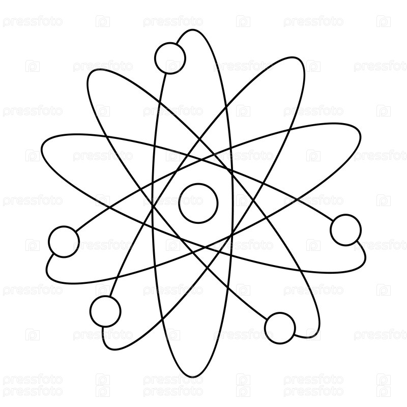Атом с иконой электронов в стиле контуры на белом фоне