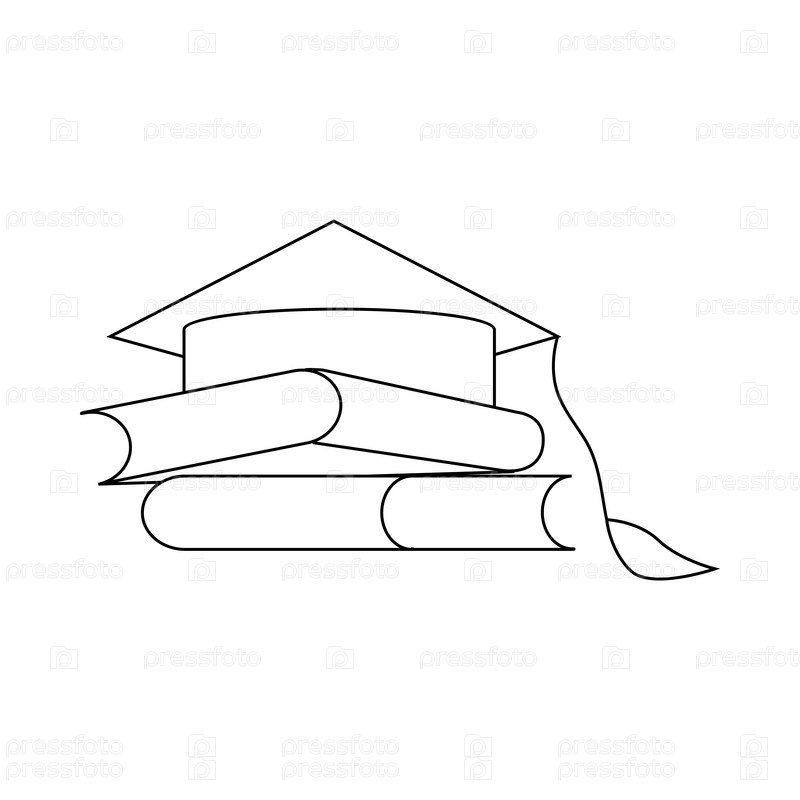 Две книги и значок выпускной шляпы в стиле контуры на белом фоне
