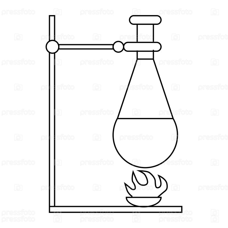 Подставка для ретортов, бунсен-горелки и значок тестовой колбы в стиле контуры на белом фоне