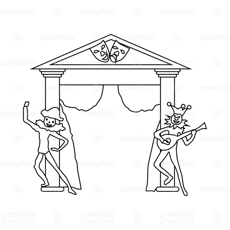 Театральная сцена с открытыми шторами и двумя актёрами-иконой в стиле контуры на белом фоне