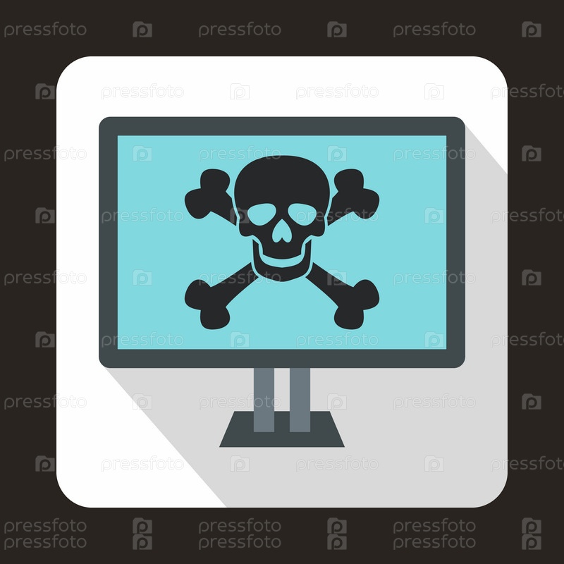 Компьютерный монитор с иконой черепа и костей в плоском стиле на белом фоне