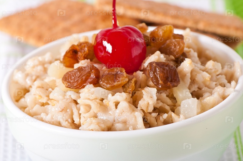 Овсяная каша с изюмом и вишней в белой миске