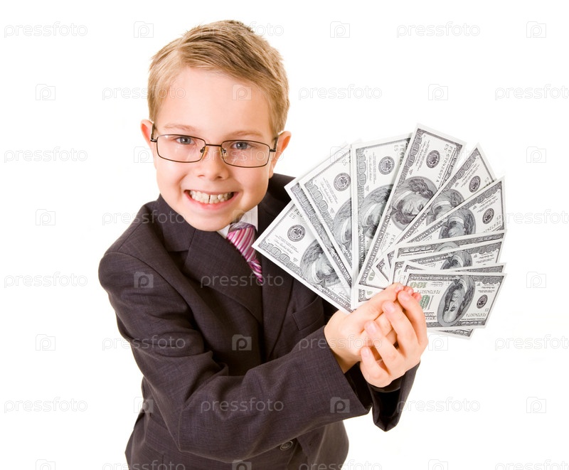 Портрет счастливого мальчика с долларовыми купюрами, смотрящего в камеру