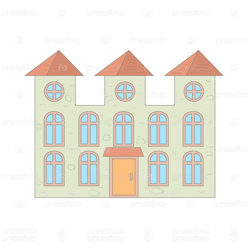 Двухэтажный дом с арочными окнами иконой в стиле мультфильма на белом фоне