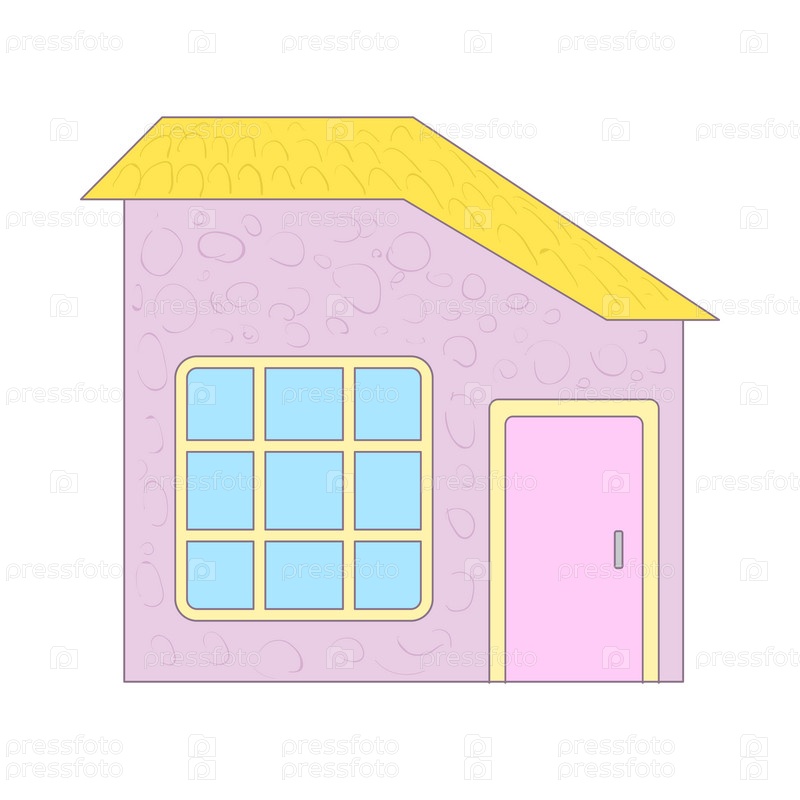 Коттедж с желтой крышей и большим знаком окна в стиле мультфильма на белом фоне