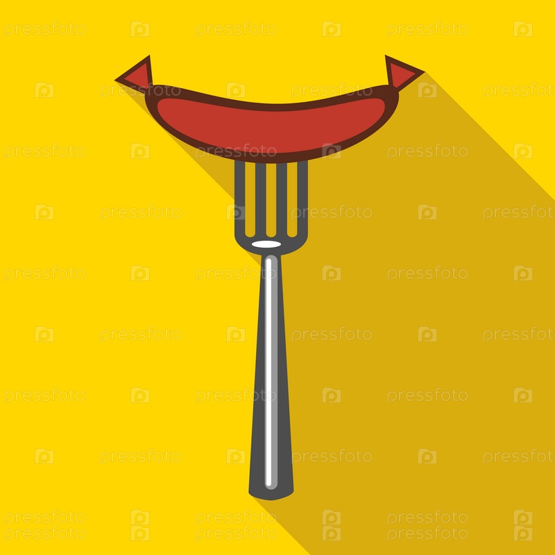 Горячая колбаса на иконе вилки в плоском стиле на желтом фоне