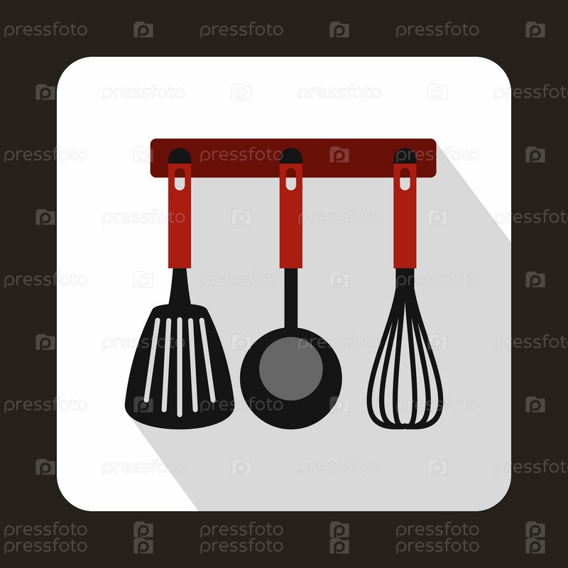 Шпатула, ложка и виска, кухонные инструменты на иконе вешалки в плоском стиле на белом фоне