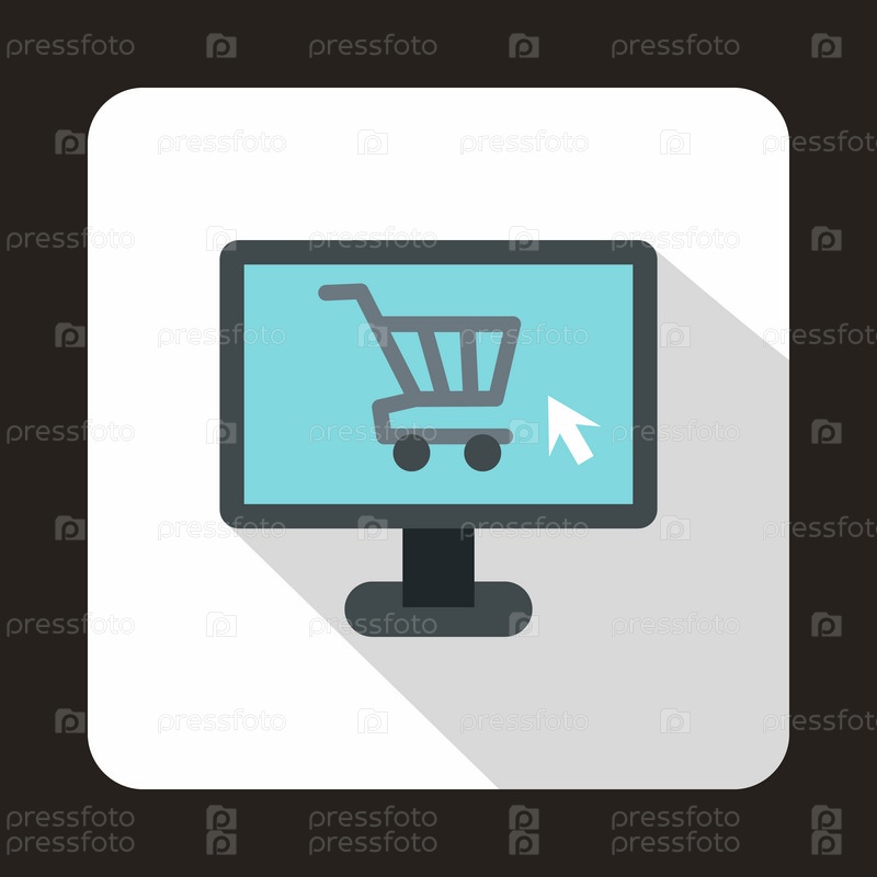 Монитор компьютера с иконой корзины покупок в плоском стиле на белом фоне