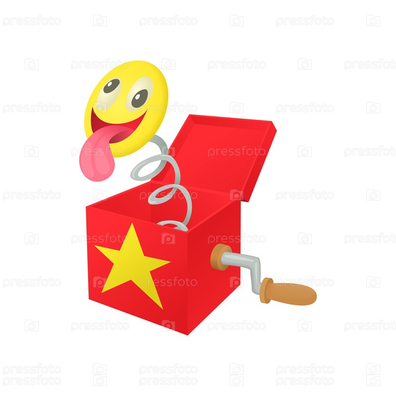 Улыбчивое лицо, выпрыгивающее из иконы коробки в стиле мультфильма на белом фоне