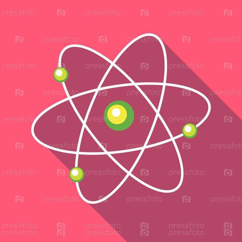 Атом с иконой электронов в плоском стиле на розовом фоне