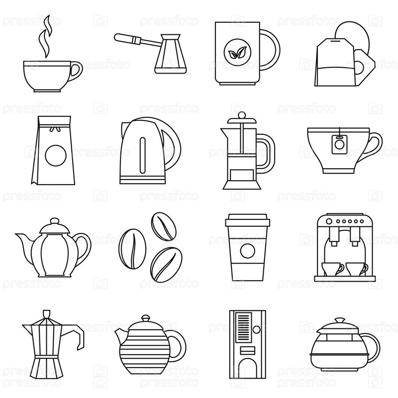 Набор икон чая и кофе, стиль контуры