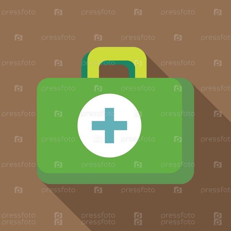 Икона зеленого медицинского ящика в плоском стиле на фоне кофе
