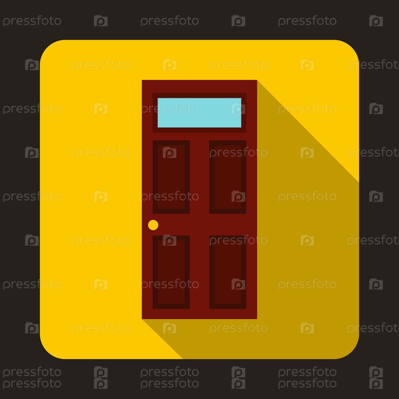 Коричневые деревянные двери со стеклянной иконой в плоском стиле на желтом фоне