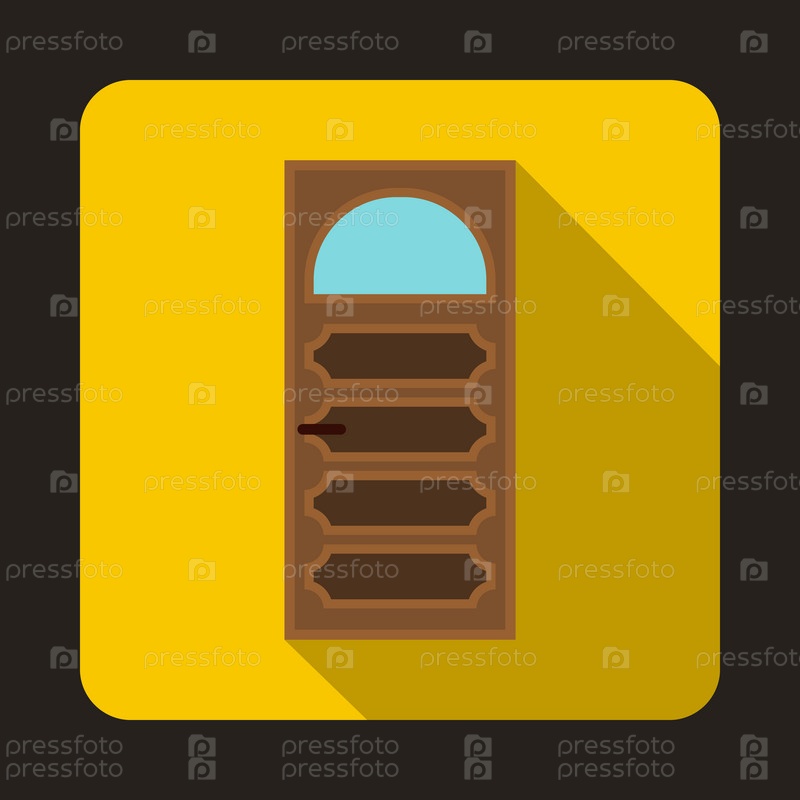 Деревянные двери с арочной стеклянной иконой в плоском стиле на желтом фоне