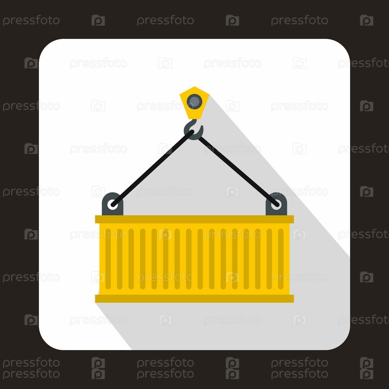 Кран поднимает иконку желтого контейнера в плоском стиле на белом фоне