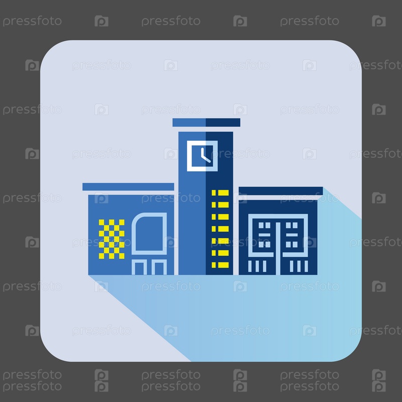 Голубое общественное здание с иконой часов в плоском стиле на светло-синем фоне