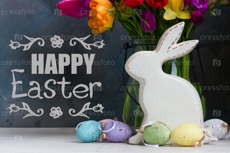 Весенние цветы с пасхальным кроликом и яйцами