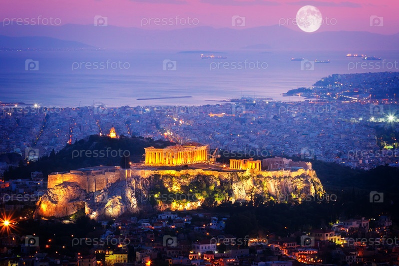 Городской пейзаж Афин ночью, Греция
