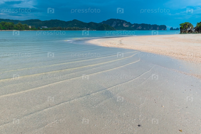 Песчаный пляж вблизи Таиланда, на горизонте зеленые горы