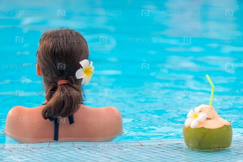 Вид на женщину сзади в бассейне и зеленый кокосовый орех со сламой