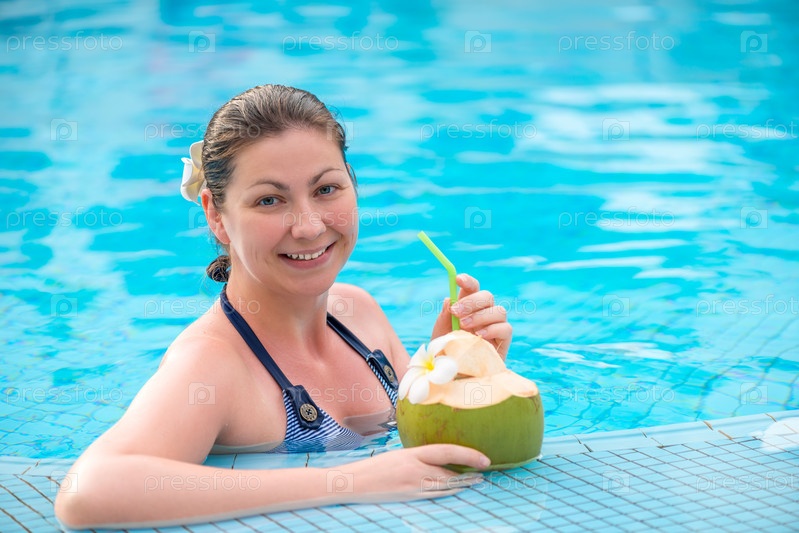 Счастливая брюнетка с кокосовым орехом, отдыхающая в бассейне на тропиках