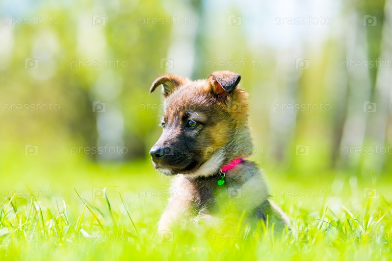 Маленькое щенко позирует, сидя в зеленой траве на лужайке