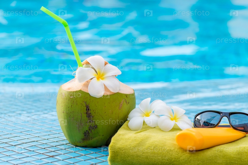 Кокосовое молоко и пляжные аксессуары вблизи на краю бассейна