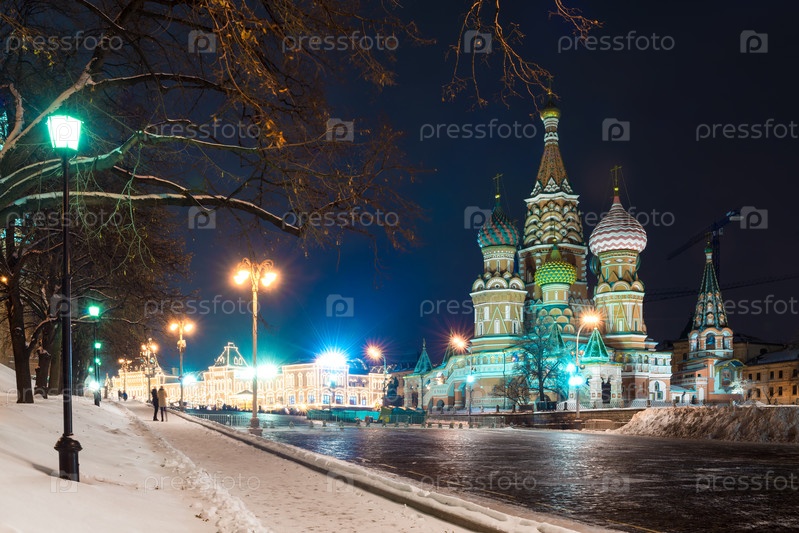 Ночной вид на город Святого Василия Блаженного на Красной площади в центре города