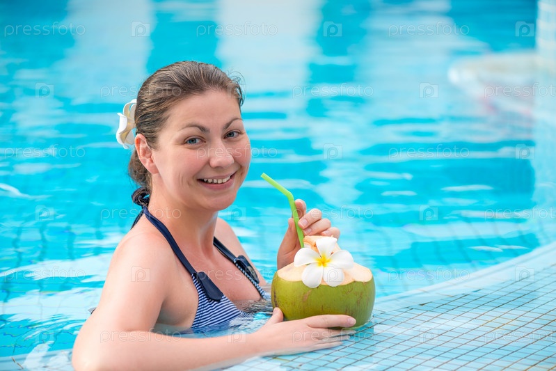 Улыбающаяся брюнетка с кокосовым орехом отдыхает в бассейне на тропиках
