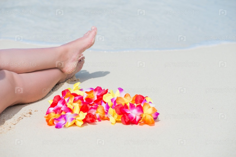 Гавайские бусы, цветочные леи и красивые женские ноги на пляже в песке