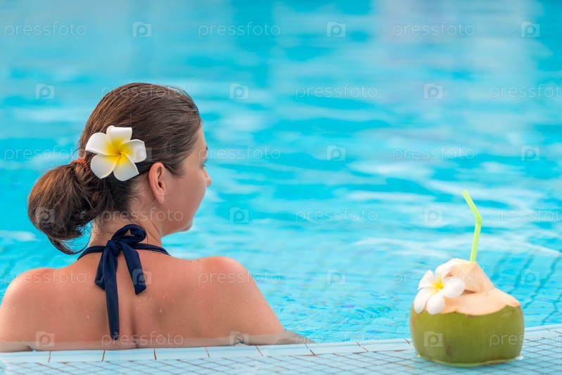 Брюнетка расслабляется в бассейне, стоя возле кокосового ореха с соломой
