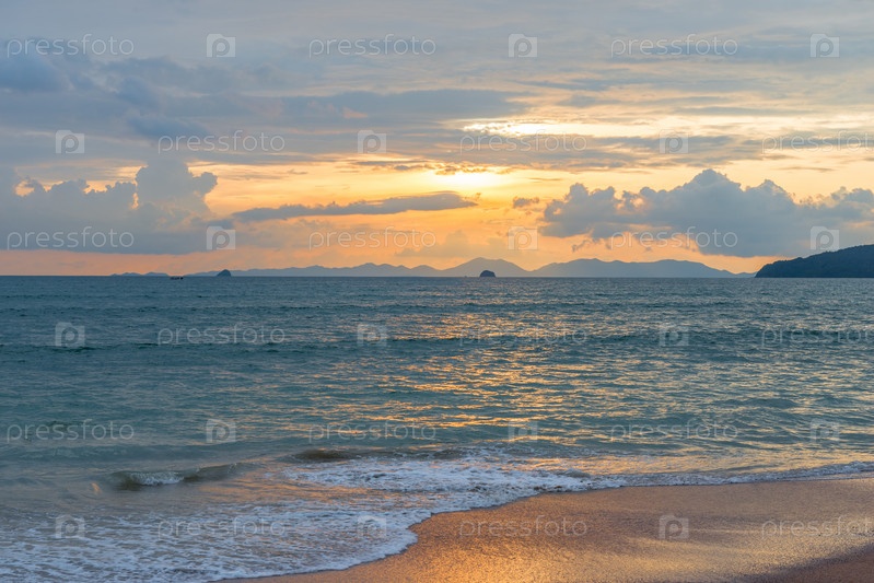 Прекрасный закат солнца в оранжевых тонах на побережье Таиланда