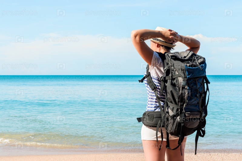 Усталый турист с рюкзаком возле моря, наслаждающийся видом